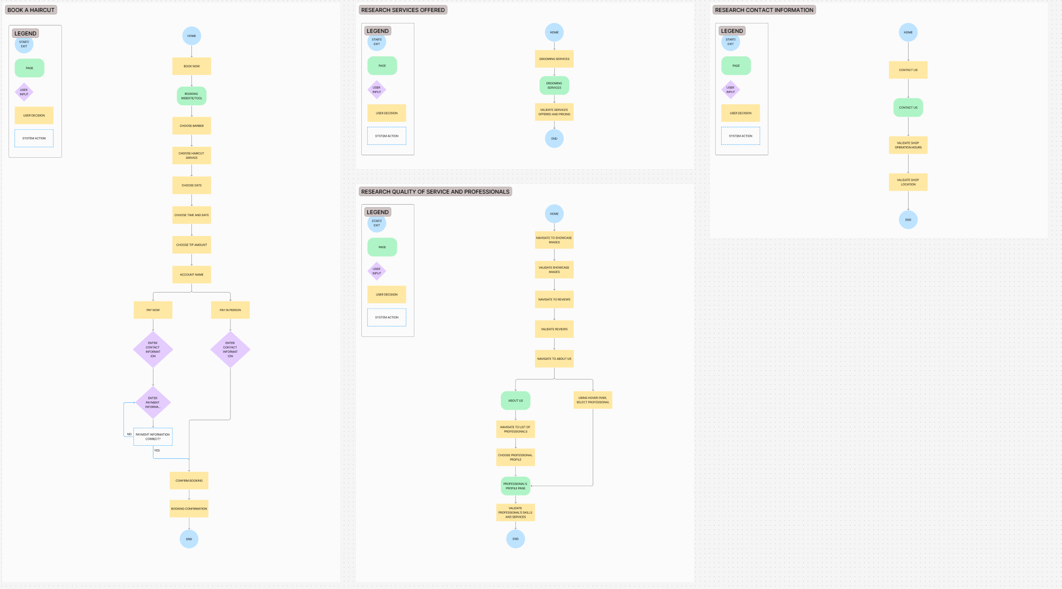I mapped out user flows to show how might my persona navigates the shop's website, specifically for: booking a haircut, researching services, evaluating service and professional quality, and confirming contact information. As stated earlier, the actual booking occurs through a separate widget.