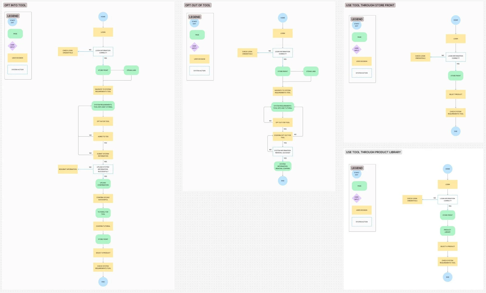 I created user flows to demonstrate how users matching my personas would interact with this feature. The process includes an initial opt-in step, followed by feature access from either the product page or user library. Users can opt-out at any time if the feature no longer meets their needs.