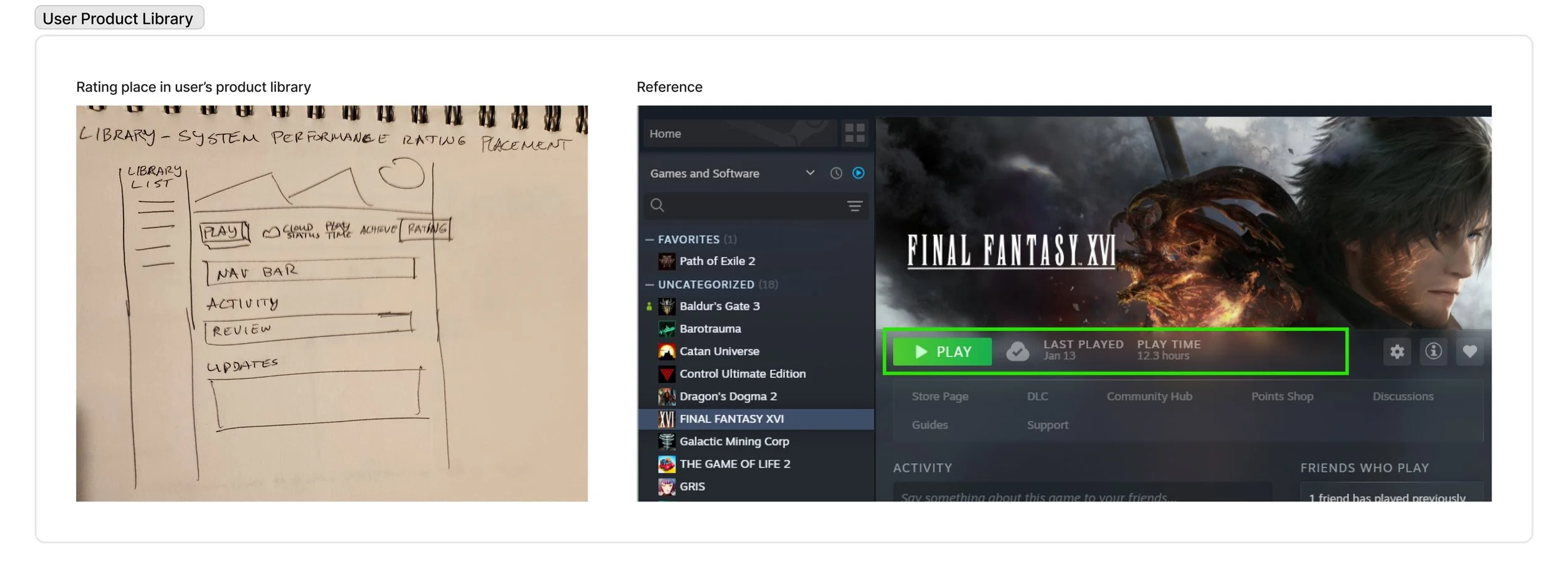 Through rapid sketching and using user flows and Steam's existing interface as references, I strategically positioned the new feature within key pages for optimal user accessibility.